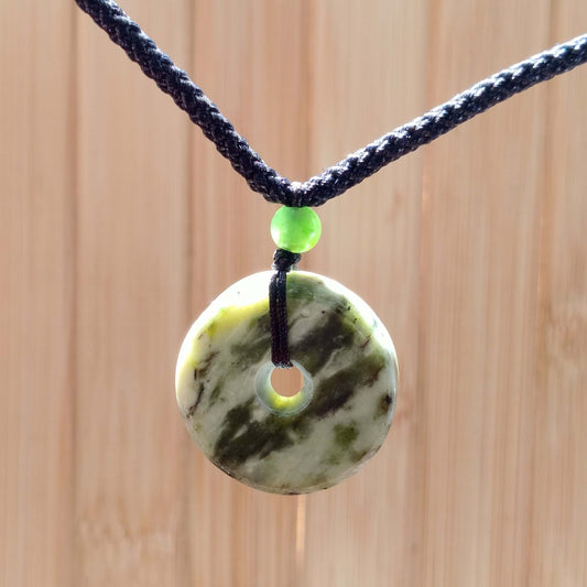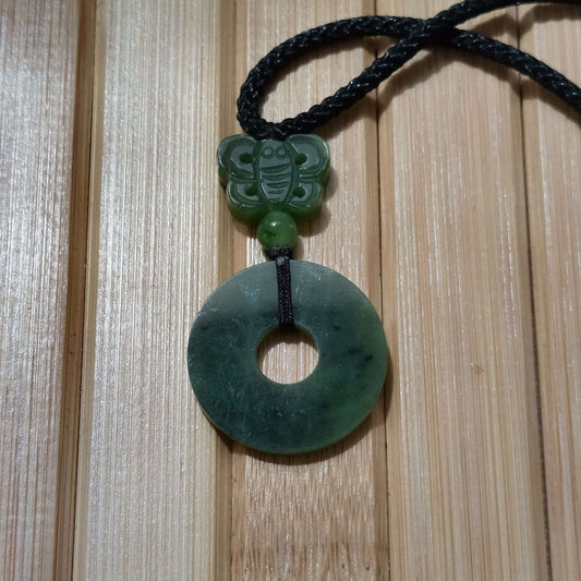 Green Jade Pi Disc Pendant with Jade Butterfly on Adjustable Cord